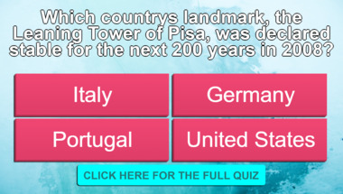 6/10 is the score to beat in this trivia quiz to put yourself over the average quiz taker. But you're probably going to be able to answer questions "What language is spoken in France?" and "Which country's landmark, the Leaning Tower of Pisa, was declared stable for the next.." easy!