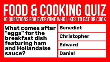 In this fun trivia quiz we're going to ask questions like "What comes after "eggs" for the breakfast dish featuring ham and Hollandaise sauce?" and "What cooking verb means to remove impurities from the surface of a liquid?".