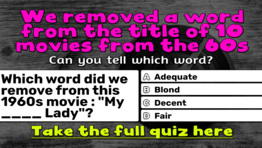 6/10 is the score to beat in this trivia quiz to put yourself over the average quiz taker. But you're probably going to be able to answer questions "Which word did we remove from this 1960s movie : "The ____ of Music"?" and "Which word did we remove from this 1960s movie : "My ____ Lady"?" easy!