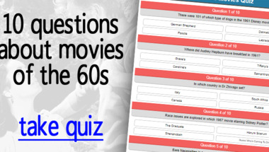 6/10 is what people on average are scoring in this 1960s Movies quiz so far. Are you ready to answer questions like "There were 101 of which type of dogs in the 1961 Disney movie?" and "Where did Audrey Hepburn have breakfast in 1961?"
