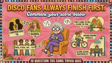 7/10 is what people on average are scoring in this 1970s songs quiz so far. Are you ready to answer questions like "The New Seekers were going to beg, steal or what in 1972?" and "Barbra Streisand sang which of these songs back in 1975?"