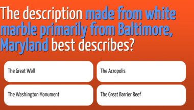 6/10 is the score to beat in this Geography quiz to put yourself over the average quiz taker. But you're probably going to be able to answer questions "If you are in the city of Cork, where are you?" and "The description "made from white marble primarily from Baltimore, Maryland" best desc.." easy!